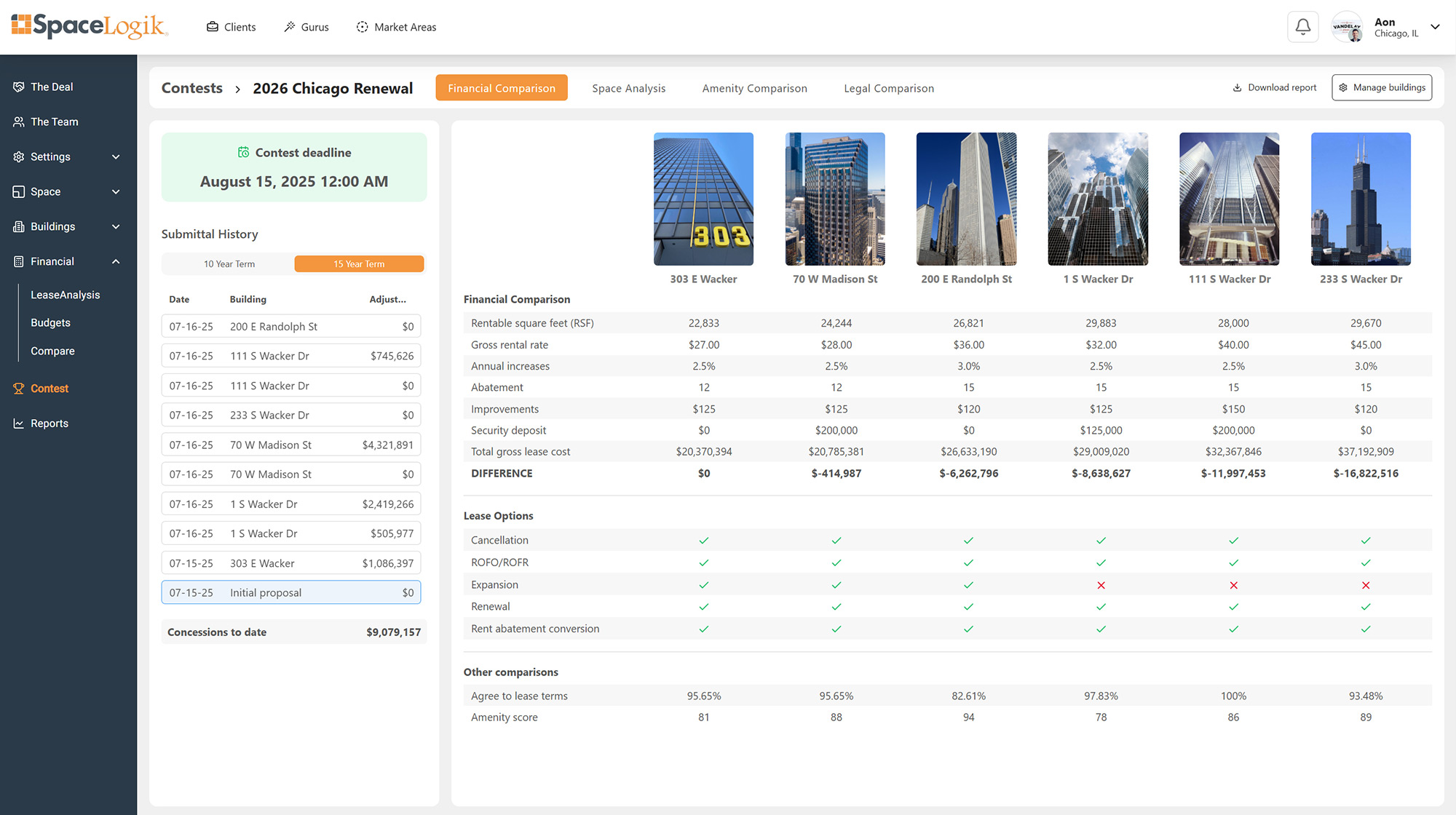SpaceLogik’s Compare tool lets users analyze unlimited landlord proposals side-by-side. It generally takes months to gather this information for a handful of buildings, but with SpaceLogik.